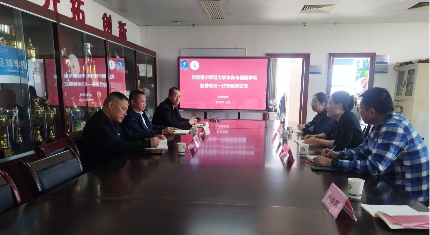 12月23日,调研团队转赴广州体育学院足球学院进行深入交流。广州体育学院足球学院朱桂林院长详细介绍了学院在办学定位、组织架构、人才培养模式创新、社会服务以及国际化拓展等方面取得的显著成效,特别是与教育系统深度协同,创新构建足球人才3+4贯通培养模式的经验。